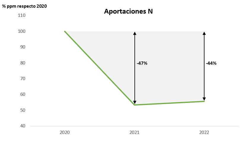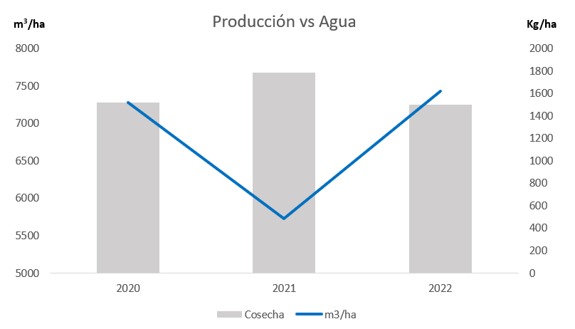 - En cuanto a la gestión de la fertilización, se logró aumentar notablemente la disponibilidad de Potasio en la solución del suelo. También se alcanzó una reducción significativa en unidades de Nitrógeno aplicadas al cultivo: en el año 2021 se logró una reducción del 47% de las unidades fertilizantes de nitrógeno, y en el 2022, un 44% manteniendo resultados iguales o superiores a los de 2020.